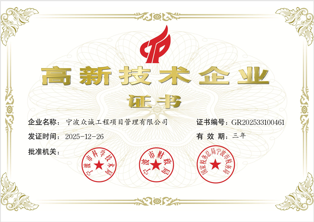 近日,寧波眾誠工程項(xiàng)目管理有限公司(以下簡(jiǎn)稱“寧波眾誠工程”)順利通過國家高新技術(shù)企業(yè)認(rèn)定,正式獲頒《高新技術(shù)企業(yè)證書》(證書編號(hào):GR202533100461),認(rèn)定有效期三年。此次認(rèn)定由寧波市科學(xué)技術(shù)局、寧波市財(cái)政局、國家稅務(wù)總局寧波市稅務(wù)局聯(lián)合審核批準(zhǔn),是對(duì)公司在工程項(xiàng)目管理領(lǐng)域技術(shù)創(chuàng)新、研發(fā)能力及成果轉(zhuǎn)化水平的權(quán)威認(rèn)可。